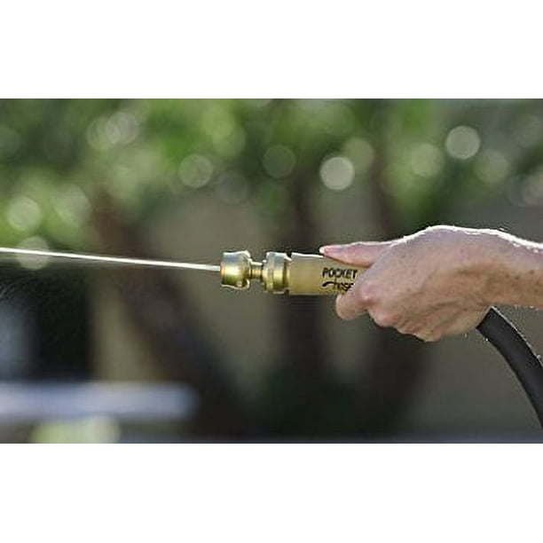 Pocket Hose Brass Bullet squeezes itself dry and allows you to water, wash, and spray with no winding, coiling, or muddy messes.