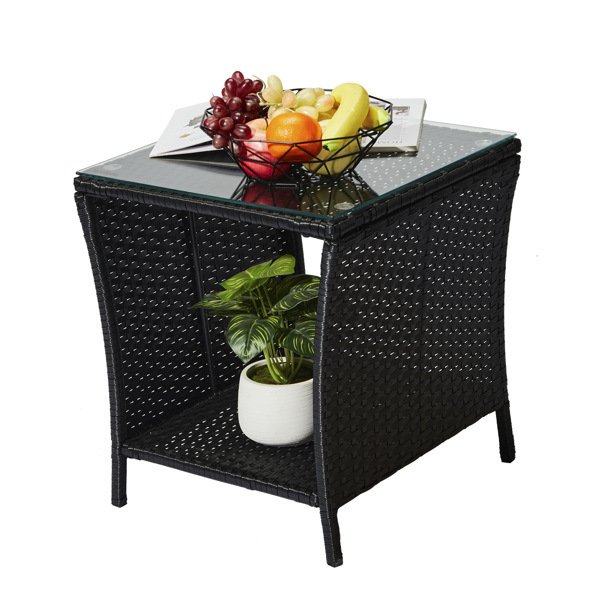 Home > Outdoor Patio Wicker Side Table, Square End Table Bistro Coffee Table with Glass Top Storage Shelf for Porch Garden Backyard Black