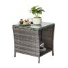 Outdoor Patio Wicker Side Table, Square End Table Bistro Coffee Table with Glass Top Storage Shelf for Porch Garden Backyard Grey